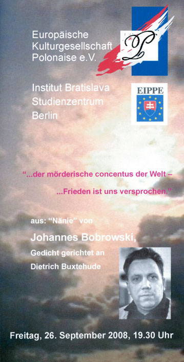 Europäische Kulturgesellschaft Polonaise - Prof. Jürgen Rasinski D-12103 Berlin - Werderstraße 23 - Tel. +49 30 / 398 06 340 Kontakt: europolonaise@t-online.de Archiv Konzerte, Vorträge, Projekte seit 2002 |
